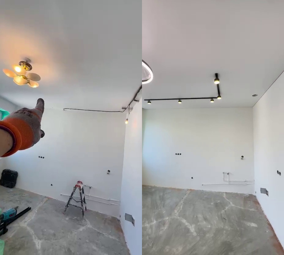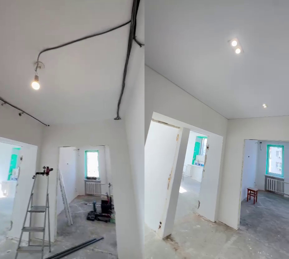 И такая получилась гостиная-кухня. Трековая система смонтирована с учетом габаритов кухонного гарнитура. Собираем инструмент, убираем за собой мусор и с чувством удовлетворения от проделанной работы прощаемся с довольным заказчиком. Этот объект был всем хорош: объем, интересная работа, адекватный клиент, пустое помещение. Всегда бы так!